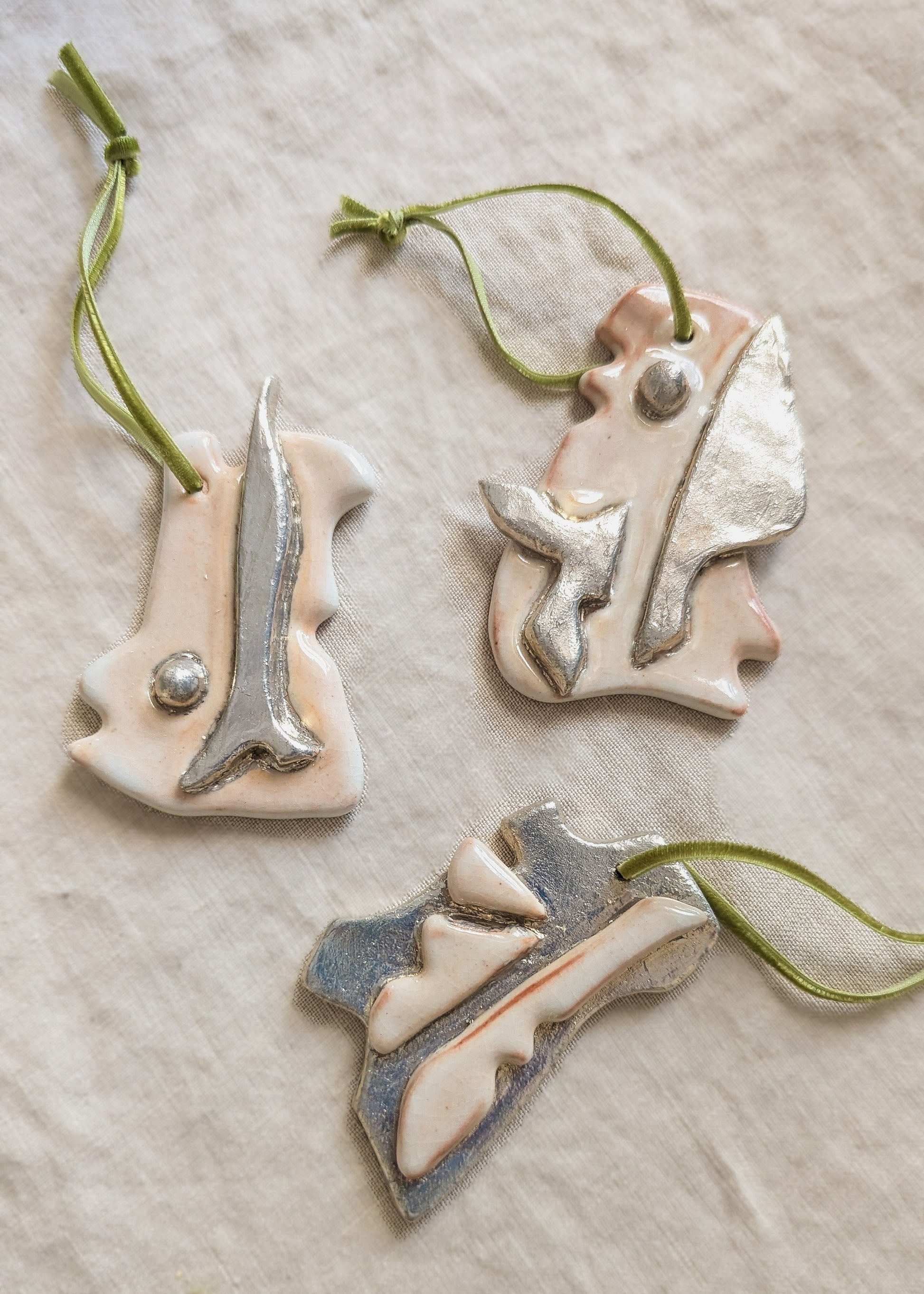 Description: Using clay off-cuts, these hand-made and pewter-gilded ceramic ornaments are inspired by a swirl of artists' personal references: from Rorschach inkblots and Arcosanti architecture to Eastern European winter holiday folklore. A little whimsical, a little uncanny, and made to delight year after year. Available in tonal, distressed cherry shino or pink shino, with new colorways coming soon!