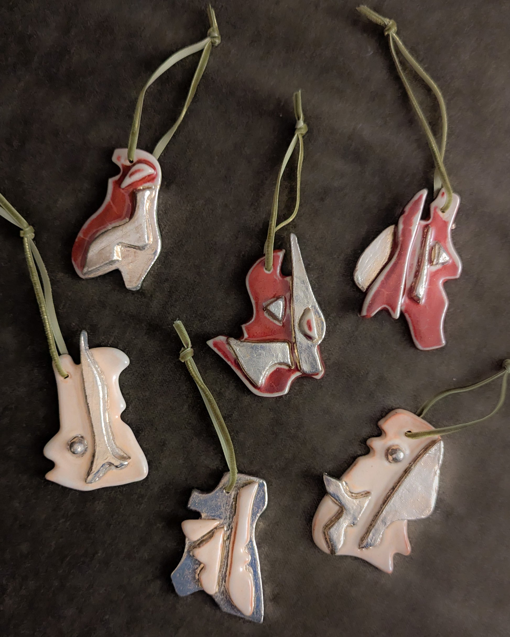 Description: Using clay off-cuts, these hand-made and pewter-gilded ceramic ornaments are inspired by a swirl of artists' personal references: from Rorschach inkblots and Arcosanti architecture to Eastern European winter holiday folklore. A little whimsical, a little uncanny, and made to delight year after year. Available in tonal, distressed cherry shino or pink shino, with new colorways coming soon!