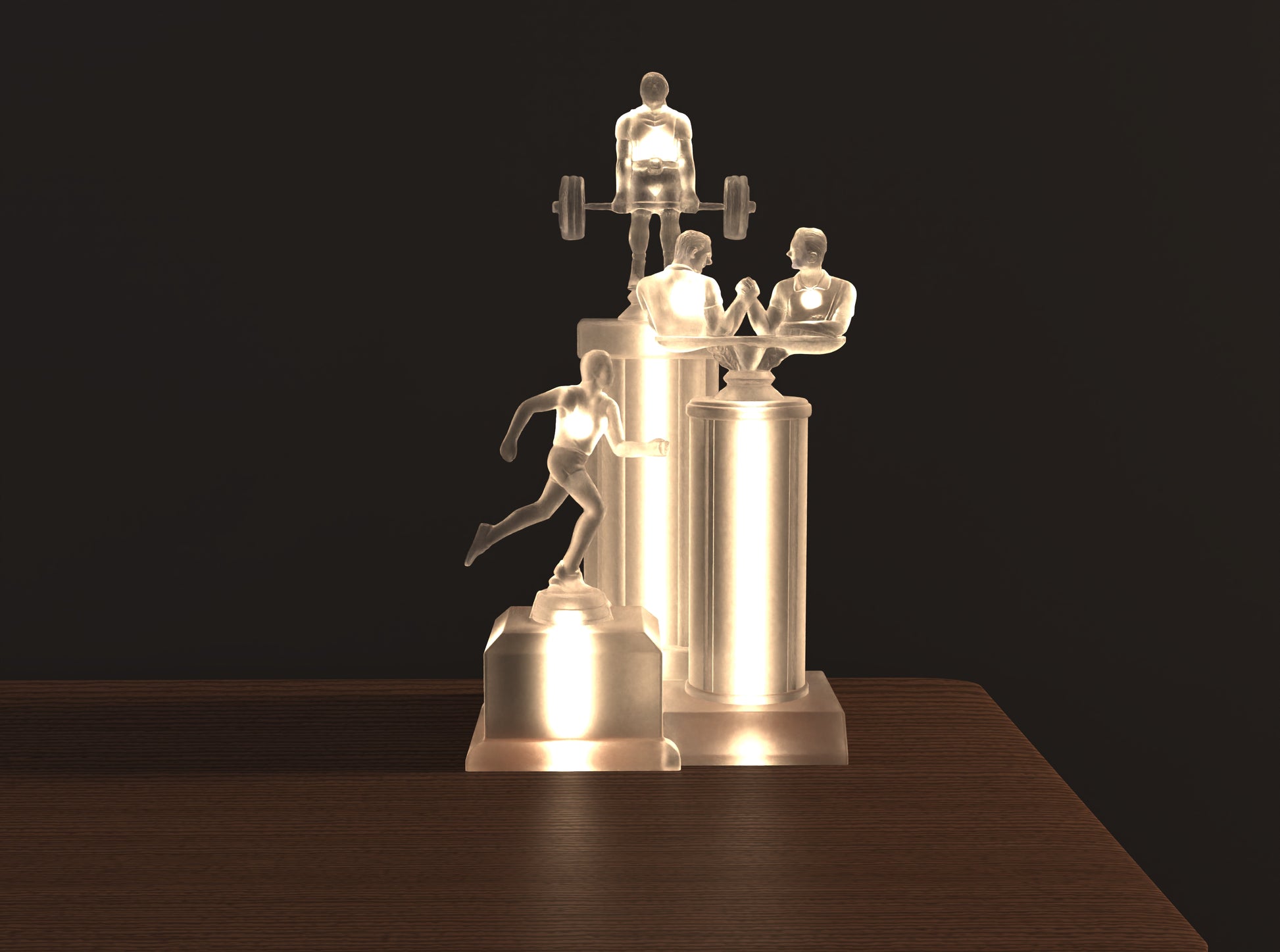 Winning Spirit is a meditation on the empty pursuit of achievement. We all know the feeling: the endless rat race treadmill towards "success". What award, promotion or milestone are you chasing? This sculptural light serves as commentary on the empty pursuit of trophies just like these where a weightlifter, arm wrestlers and a runner embody the challenges of modern living. The hollow, translucent forms suggest that in a world where “winners” take nothing of true substance, genuine fulfillment and light comes from within.